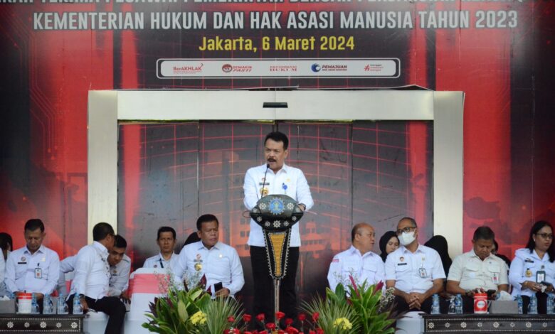 BeritaNasional.ID, JAKARTA – Sebagai bentuk komitmen pemerintah dalam menata pegawai non ASN, Kementerian Hukum dan HAM (Kemenkumham) telah menyelesaikan penataan tenaga non ASN dengan menetapkan 879 orang Pegawai Pemerintah dengan Perjanjian Kerja (PPPK) yang berhasil lulus tahapan seleksi akhir. Penetapan tersebut ditandai dengan kegiatan Serah Terima PPPK tahun anggaran 2023 di lapangan upacara Kemenkumham, Rabu (6/3).