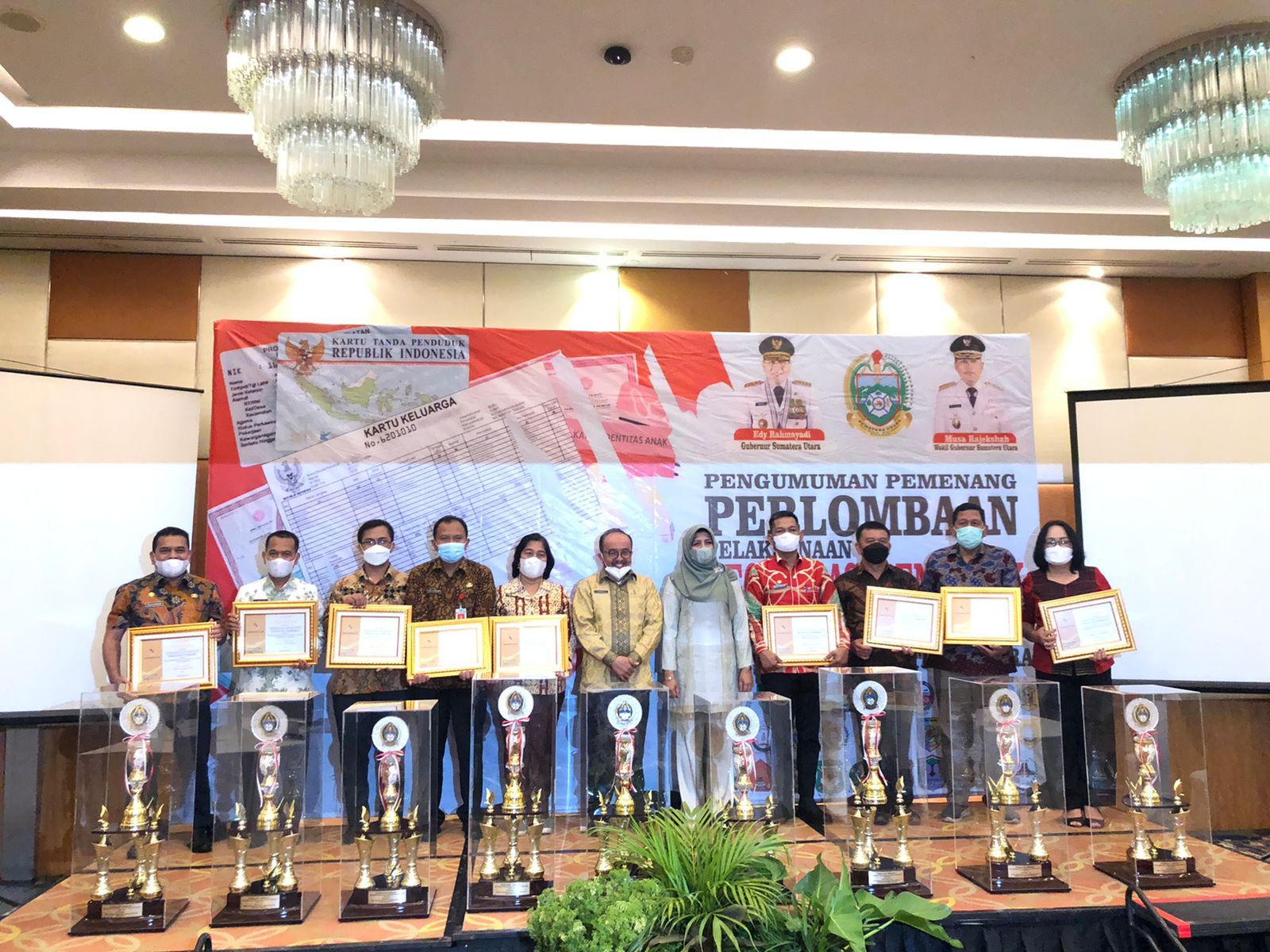 Penghargaan tersebut diteirma Plt. Kadisdukcapil Asahan Rahmanto S.Sos, MSi dari Kepala Dinas Kependudukan dan Pencatatan Sipil Provinsi Sumatera Utara Dra. Manna Wasalwa Lubis MAP dalam acara pengumuman pemenang lomba kegiatan yang dilaksanakan di Cambridge Hotel Medan, Jumat (17/12/2021).