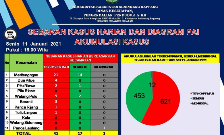 Penambahan kasus terkonfirmasi positif dari 41 kasus tersebut tersebar dari 7 Kecamatan di Sidrap, mereka di antaranya, Kecamatan MaritengngaE (21), Pitu Riase (4), Pitu Riawa (2), Wt Pulu (9), Baranti (3), Panca Rijang (1) dan Tellu LimpoE (1).