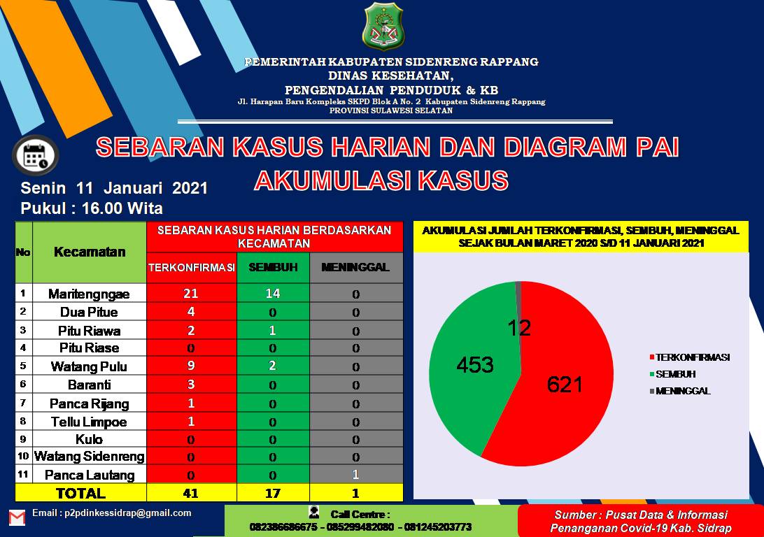 Hari ini, ada tambahan sebanyak 41 kasus yang terkonfirmasi positif covid-19, dan sisi lainnya juga adanya penambahan pasien covid-19 Sidrap yang sembuh, jumlahnya sebanya 17 kasus.