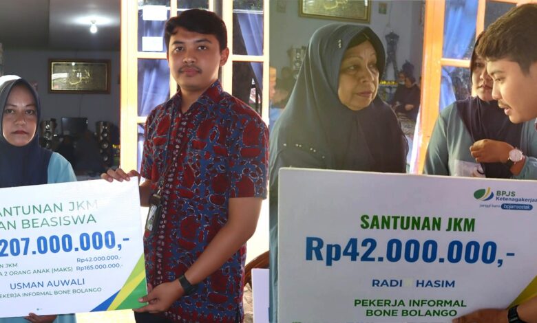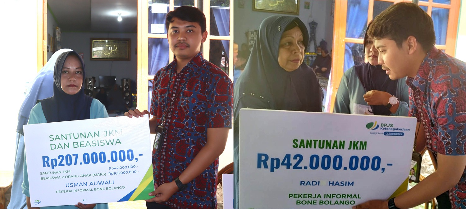 BeritaNasional.ID, BONE BOLANGO GORONTALO – Badan Penyelenggara Jaminan Sosial (BPJS) Ketenagakerjaan atau BPJamsostek Cabang Gorontalo menyerahkan santunan Jaminan Kematian (JKM) kepada ahli waris almarhum Radi Hasim sebesar Rp42 juta, serta santunan JKM dan manfaat beasiswa ahli waris almarhum Usman Auwali sebesar Rp207 juta. Total santunan dan beasiswa yang diserahkan sebesar Rp249 juta.