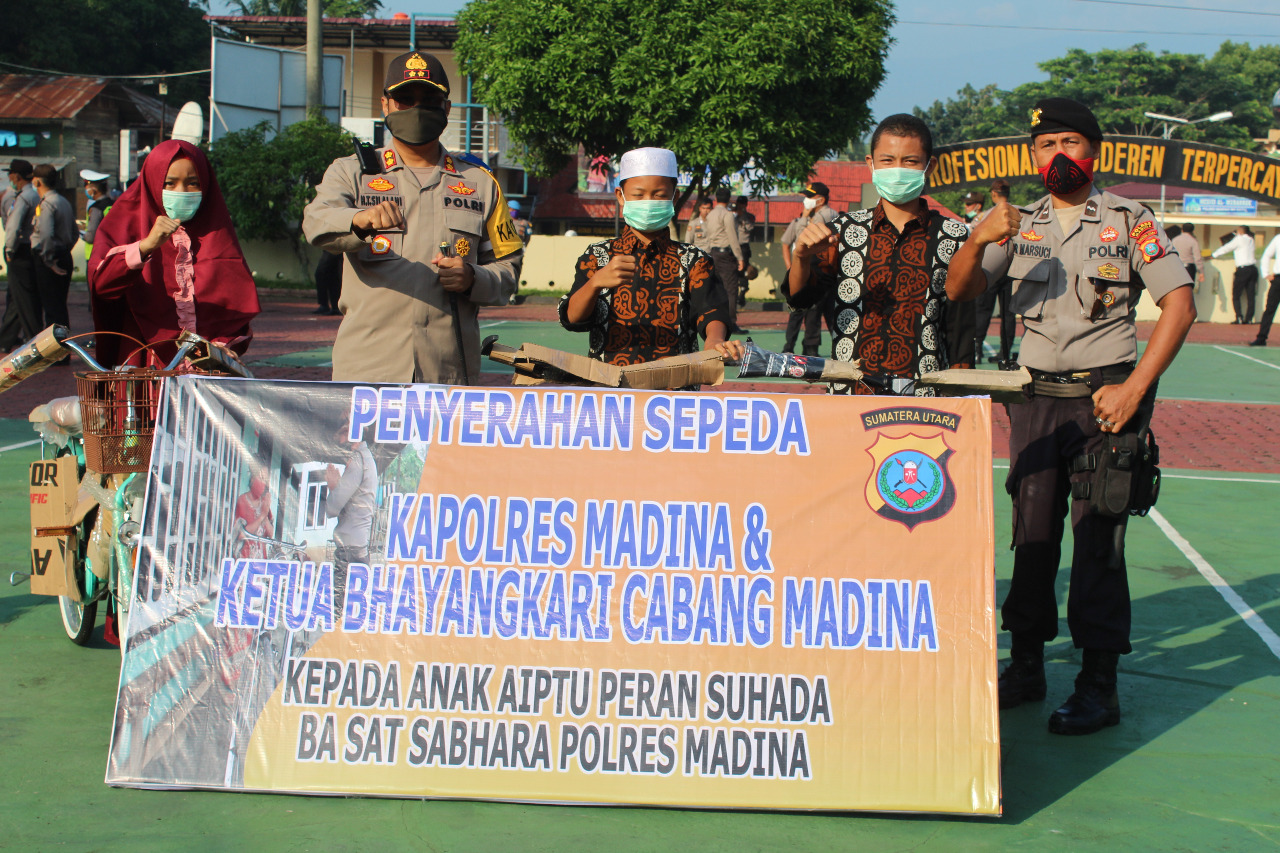 “Terima kasih buat bapak Kapolda Sumut dan Kapolres Madina yang telah berbaik hati, memberikan hadiah sepeda baru buat saya dan ketiga buah hati saya, semoga Tuhan Yang Maha Esa dapat membalas kebaikan yang kami dapatkan ini dan sepeda baru dari Bapak Kapolda Sumut Irjen Drs. Martuani Sormin, M.Si akan saya gunakan sebagai kenderaan saya, dari rumah ke kantor juga segala tugas yang saya emban setiap harinya selaku personil sat sabhara Polres Madina,” ucap Aipda Peran Suhada, S.H dengan rasa haru dan mata berkaca-kaca.