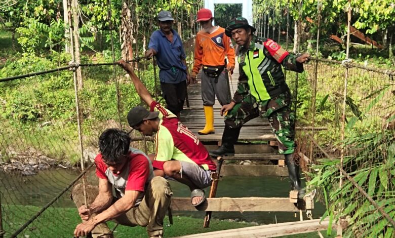 BeritaNasional.ID.POLMAN SULBAR —Semangat gotong royong senantiasa tercipta oleh babinsa di tengah-tengah masyarakat binaannya. Hal itu terlihat ketika Babinsa Koramil 1402-02/ Wonomulyo Sertu Bambang Irawan, bersama masyarakat Desa Tapua, Kecamatan Matangnga, Bahu membahu memperbaiki jembatan gantung yang sudah rusak. Sabtu (10/6/2023).