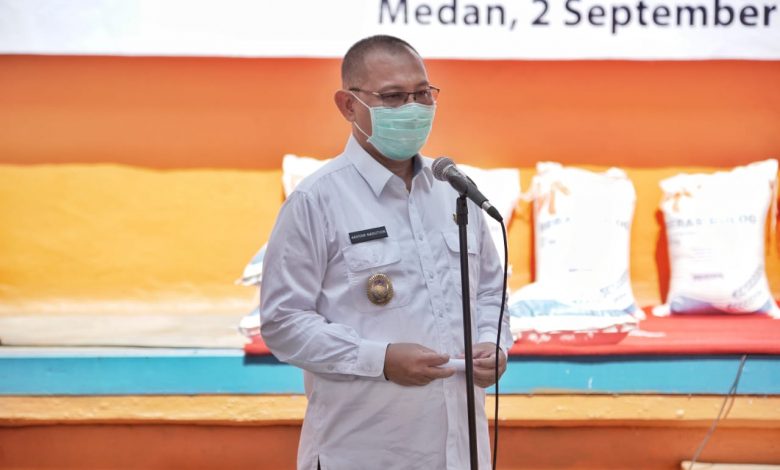 BeritaNasional.ID Medan – Pelaksana tugas (Plt) Wali Kota Medan Ir H Akhyar Nasution MSi menyerahkan secara simbolis bantuan sosial (bansos) berupa beras untuk masyarakat di Komplek Pergudangan Perum Bulog Jalan Jemadi Medan, Rabu (2/9/2020). Pemberian bantuan ini dilakukan dalam Launching Program Bantuan Sosial Beras Untuk Keluarga Penerima Manfaat Program Keluarga Harapan (KPM PKH) dari Kementerian Sosial (Kemensos) RI.