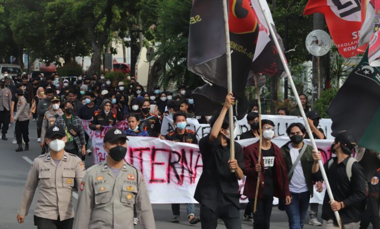 BeritaNasional Kota Serang – Polda Banten melakukan pengawalan long march aksi unjuk rasa Mahasiswa yang tergabung dalam Aliansi Pendidikan Merdeka (Apem) dari kampus Untirta Pakupatan ke lampu merah Alun-alun Barat Kota Serang pada Rabu (17/11/2021).