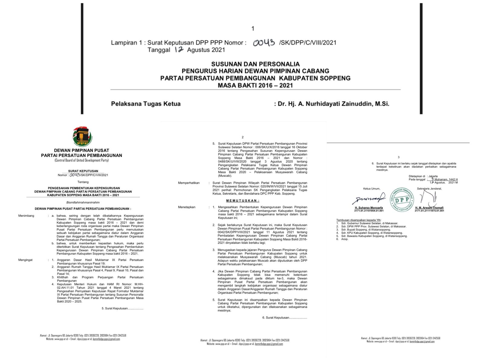 Hal ini berdasarkan Surat Keputusan (SK) DPP PPP Nomor 0043/SK/DPP/C/VIII/2021 ditandatangani oleh Ketua Umum, H. Suharso Monoarfa dan Sekretaris Jenderal, H. M. Arwani Thomafi tertanggal 12 Agustus 2021.