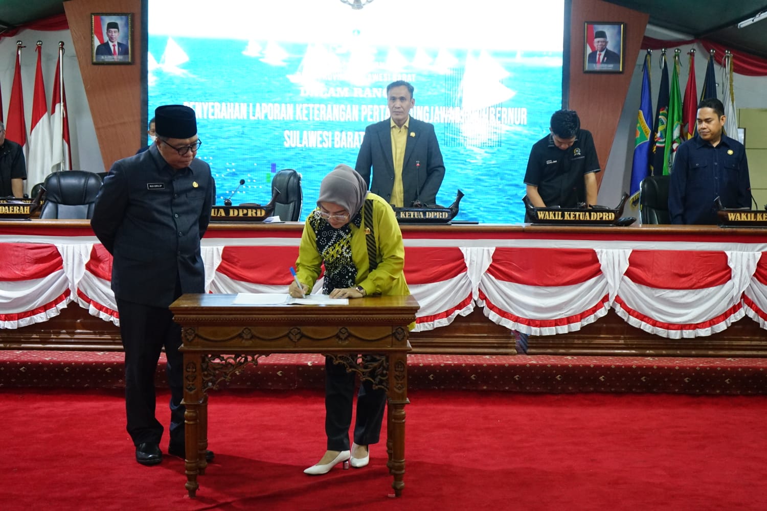 BeritaNasional.id.Sulbar–DPRD Provinsi Sulawesi Barat mengadakan Rapat Paripurna terkait penyerahan Laporan Keterangan Pertanggungjawaban Gubernur Provinsi Sulawesi Barat Tahun Anggaran 2022. Bertempat ruang rapat Paripurna DPRD Prov Sulbar. Kamis, 30/03/2023.