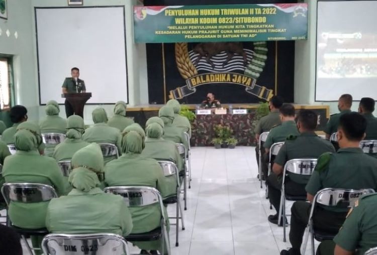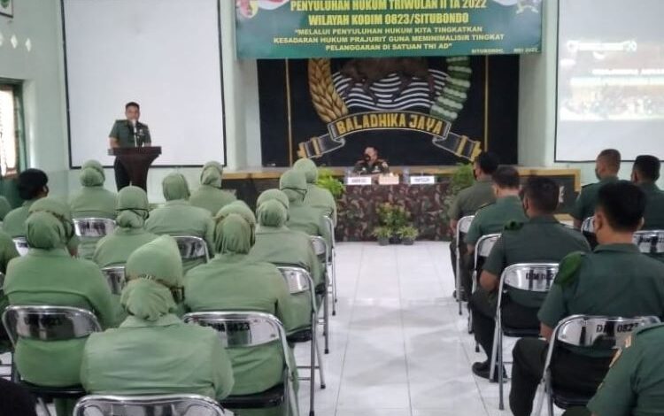 Kegiatan penyuluhan hukum yang berlangsung di aula Makodim Situbondo mengusung tema, “Melalui Penyuluhan Kukum Kita Tingkatkan Kesadaran Hukum Prajurit Guna Meminimalisir Tingkat Pelanggaran di satuan TNI AD”.