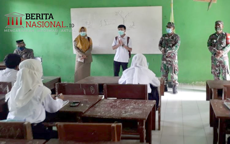 BeritaNasional.ID – SITUBONDO – Anggota Koramil 0823/08 Banyuputih Bati Tuud Peltu Sunardi bersama staf Puskesmas Banyuputih melakukan Edukasi Prokes Covid-19 ke pelajar SMPN 1 Banyuputih, Rabu (9/6/2021).