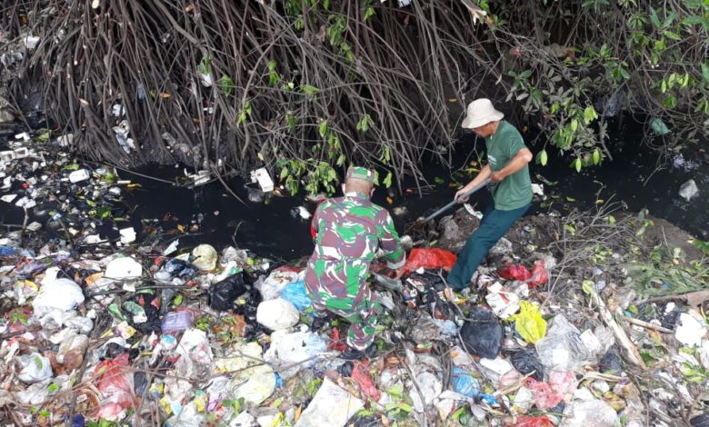 Anggota Koramil Besuki Kerja Bakti Bersihkan Sampah di Aliran Sungai