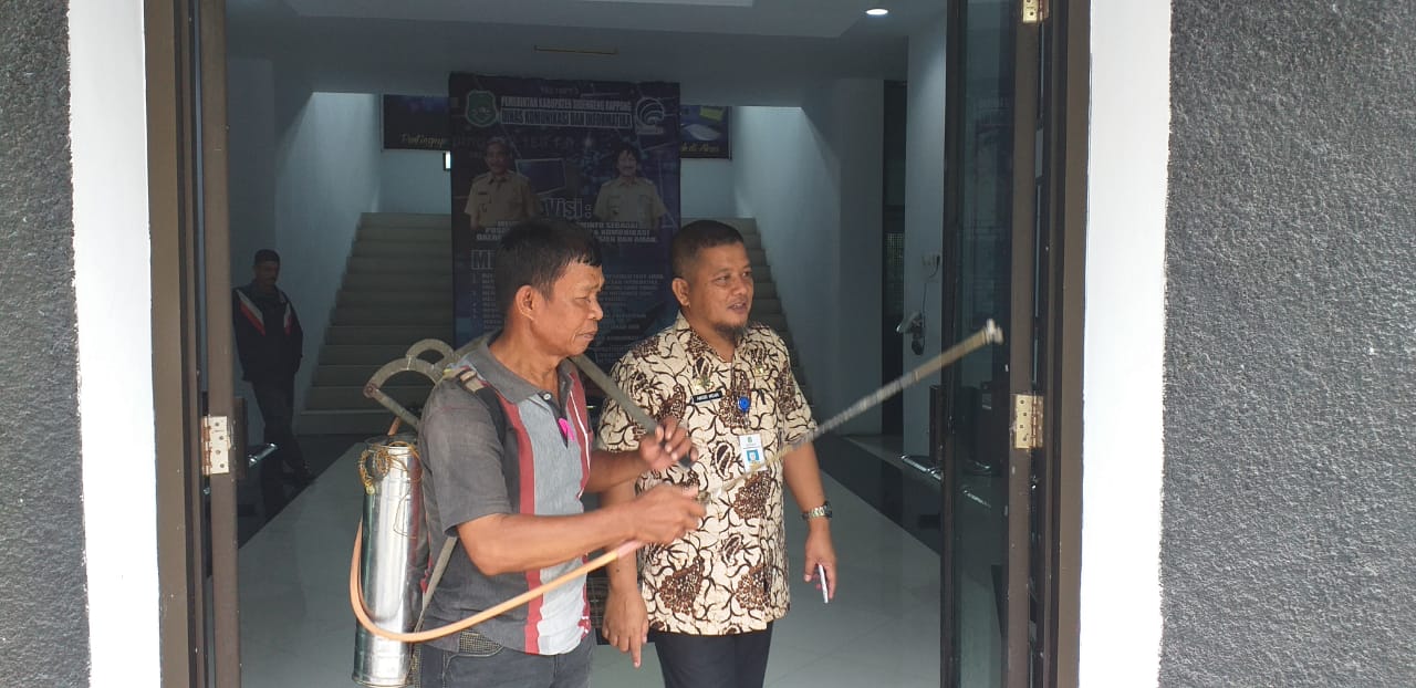 Juru Bicara Penanganan Virus Corona Sidrap, Ishak Kenre mengatakan, penyemprotan dan disinfeksi permukaan dilakukan pada lantai, perabot meja kursi kerja, termasuk pegangan pintu dan barang-barang lain yang sering dipegang.