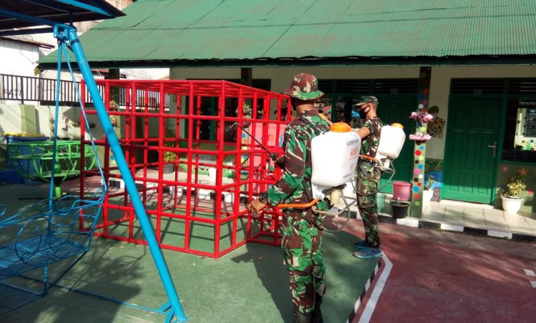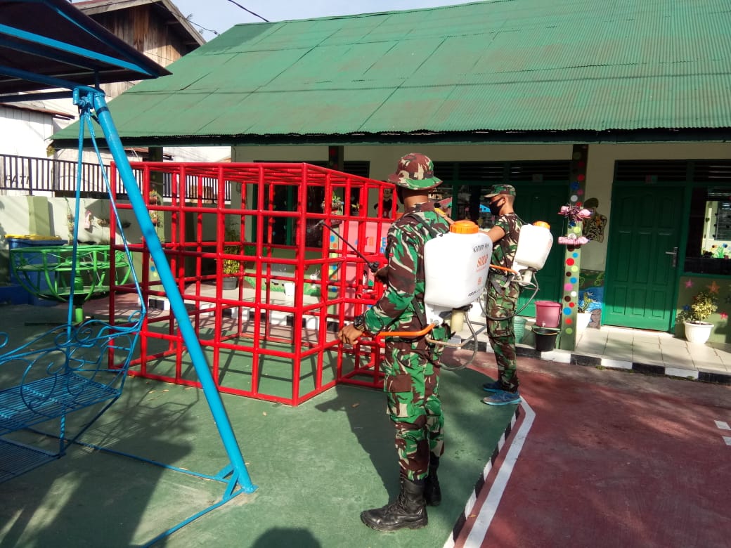 Penyemprotan dilaksanakan di kantor staf,Pos jaga,lingkungan TK Kartika,dan tempat ibadah yang berada di sekitar Makodim.