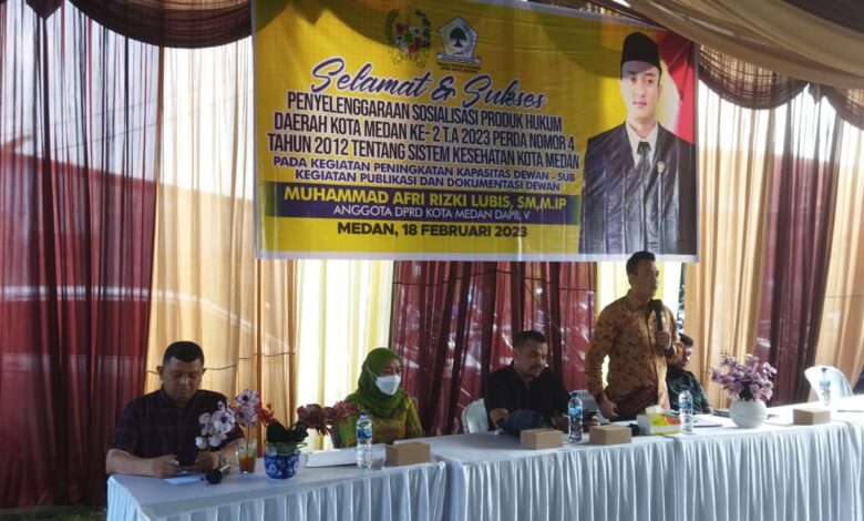BeritaNasional.ID, Medan – Pada kegiatan peningkatan kapasitas Dewan – Sub kegiatan publikasi dan dokumentasi Dewan, Anggota DPRD Kota Medan Dapil V Muhammad Afri Rizky Lubis, SM,M.IP. menyelenggarakan Sosialisasi Produk Hukum Daerah Kota Medan ke- 2 TA 2023 Perda Nomor 4 Tahun 2012 Tentang Sistem Kesehatan Kota Medan, Sabtu (18/2/2023) di Kelurahan Sari Rejo, Kecamatan Medan Polonia.