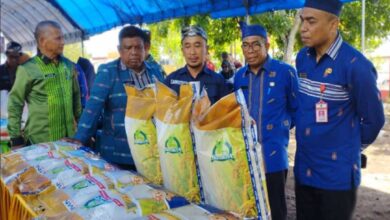 Sekretaris Daerah Kabupaten Buton Tengah, Konstantinus Bukide, Melihat display beras premium di gerai pasar mirah inisiasi Dinas Pangan Provinsi. Konstantinus didampingi Kadis Pangan Buton Tengah, Burhanudin. Kabid Kerawanan dan Kerentanan Pangan Dinas Pangan, Jumat, (25/11/2022). Stok Pangan Akhir Tahun, Dinas Pangan Provinsi Sultra Buka Gerai Pangan Murah di Buton Tengah