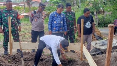 Kades Lombok Kulon meletakkan batu pertama disaksikan Kapolsek, Sekcam Wonosari, TNI, dan Pendamping Desa (Syamsul Arifin/BeritaNasional.ID) Peletakan Batu Pertama Kopdes Merah Putih Lombok Kulon