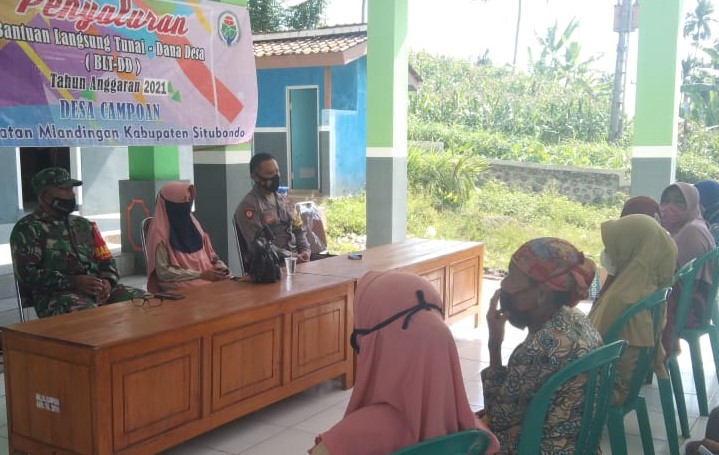 BeritaNasional.ID – SITUBONDO – Serda Domi Babinsa Desa Campoan Koramil 0823/13 Mlandingan pantau pelaksanaan pencairan BLT DD tahap III yang berlangsung di pendopo balai Desa Campoan, Kecamatan Mlandingan, Kabupaten Situbondo, Kamis (1/7/2021).