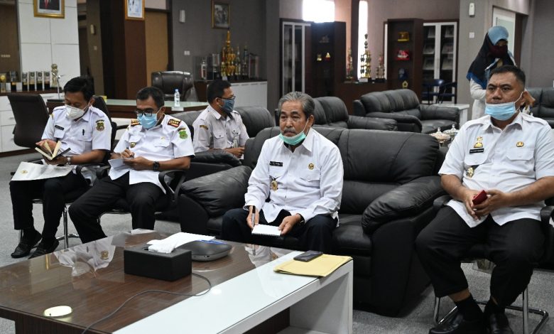Dollah Mando mengikuti vidcon dari ruang kerjanya didampingi Kepala Inspektorat, Rohady Ramadhan, Kepala BKAD, Nasruddin Waris dan Kabid Akuntansi dan Pelaporan Keuangan Daerah BKAD, Fadli Yakub.