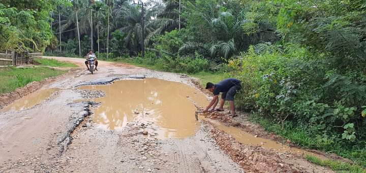 Mirisnya, ketika musim penghujan tiba seluruh badan jalan yang berlobang digenangi air seperti kolam, disebabkan tidak ada parit pembuang air di sisi kiri dan kanan jalan tersebut.