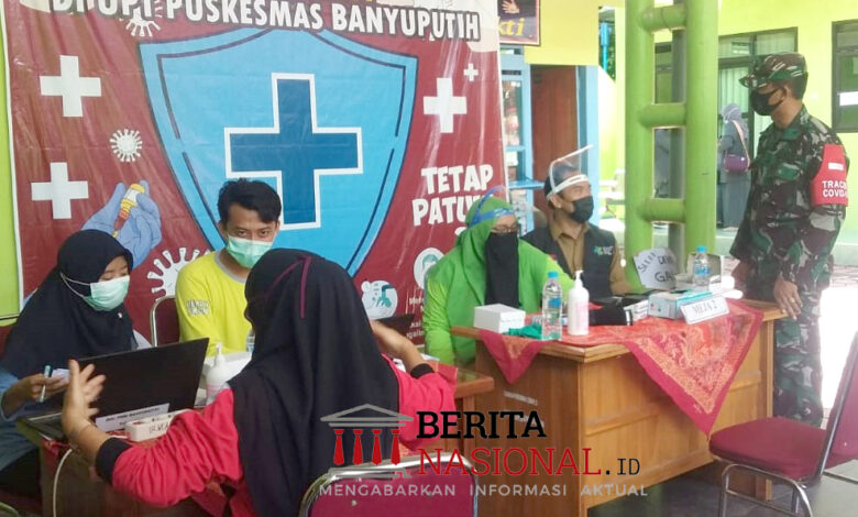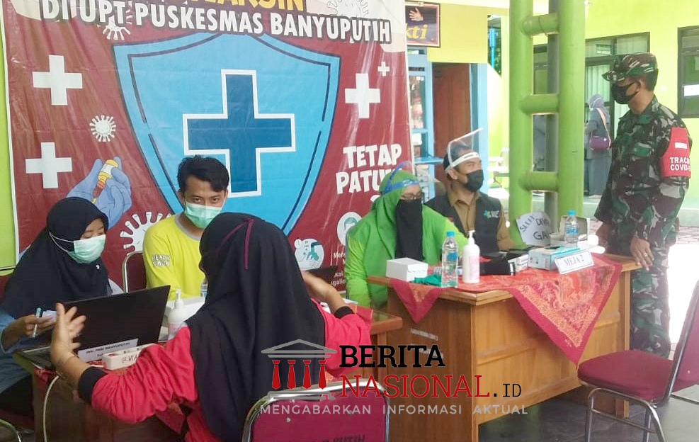 BeritaNasional – SITUBONDO – Bati Tuud Koramil 0823/08 Banyuputih Pelda Sunardi pantau kegiatan vaksinasi COVID-19 dosis ke satu untuk guru dan Kepala Sekolah SD serta MI se Kecamatan Banyuputih, Kabupaten Situbondo, Selasa (30/3/2021).