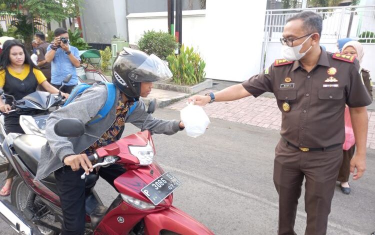 BeritaNasional.id – SITUBONDO JAWA TIMUR – Kajari Situbondo bersama ibu- ibu Adhyaksa Dharma Karini Situbondo dan seluruh pegawai dan jaksa di Kejaksaan Negeri Situbondo turun jalan membagikan takjil buka puasa kepada masyarakat umum yang melintas di depan Kantor Kejaksaan Negeri Situbondo, Selasa (12/4/2022).