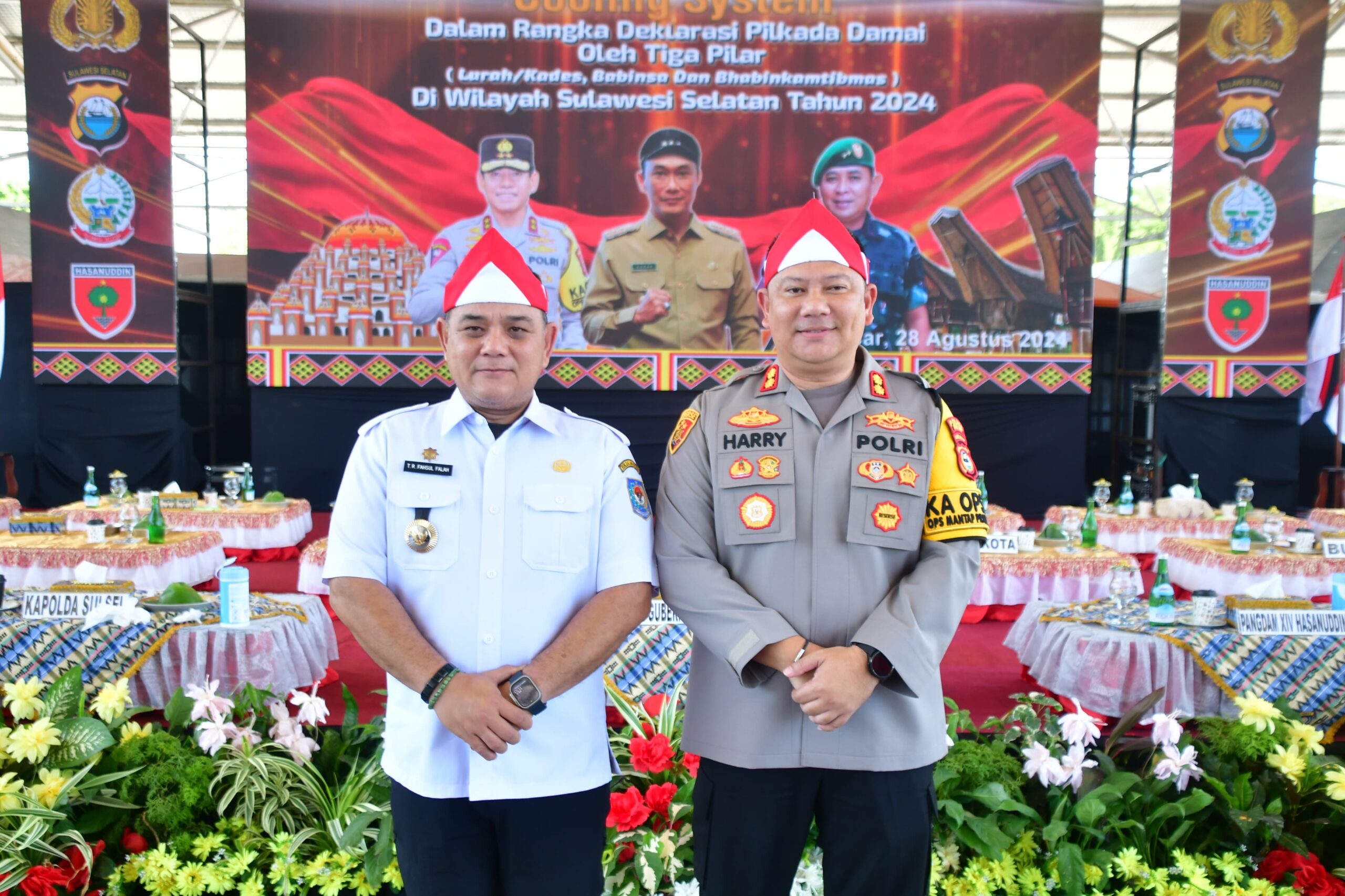 BeritaNasional.ID, MAKASSAR SULSEL – Bersama Kapolres Sinjai, AKBP Harry Azhar Hasry, (Pj) Bupati Sinjai, T.R. Fahsul Falah menghadiri Cooling System dalam rangka deklarasi Pemilihan Kepala Daerah (Pilkada) Damai, Rabu (28/08/2024).