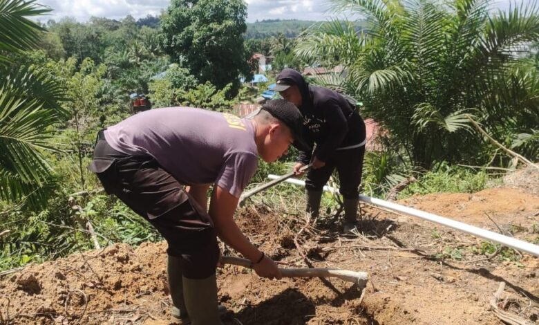 Bhabinkamtibmas Polsek Sekadau Hilir Ikut Gotong Royong Pemasangan Pipa Air Bersih