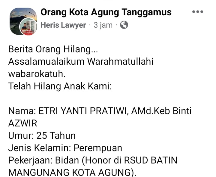 “Berita Orang Hilang. Assalamualaikum Warahmatullahi wabarokatuh. Telah Hilang anak kami. Nama Etri Yanti Pratiwi, A.Md. Keb, Umur 25 tahun, Jenis kelamin perempuan, Pekerjaan Bidan Honorer RSUD Batin Mangunang Kota Agung, Alamat Jl. Kenanga RT.005/RW.002, Kel. Pasar Madang, Kec. Kota Agung, Kab. Tanggamus,” tulis Heri Lawyer.