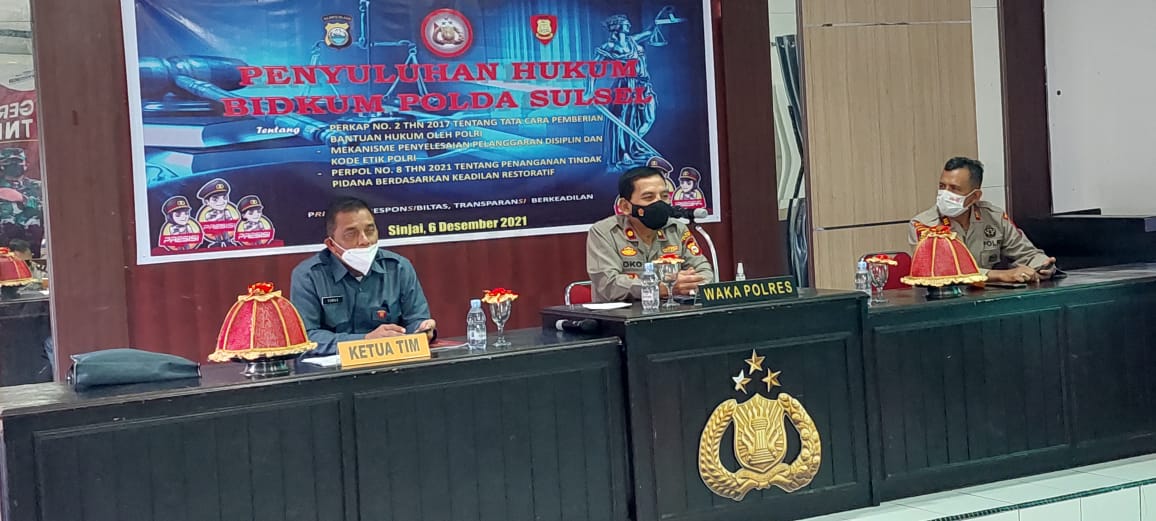 Selanjutnya Tim Bidkum Polda Sulsel menyampaikan materi penyuluhan terkait dengan Perkap Nomor 2 Tahun 2017 tentang tata cara pemberian bantuan hukum oleh Polri, Mekanisme Penyelesaian Pelanggaran Disiplin dan Kode Etik Polri, Perpol Nomor 8 Tahun 2021 tentang Penanganan Tindak Pidana berdasarkan Keadilan Restoratif.
