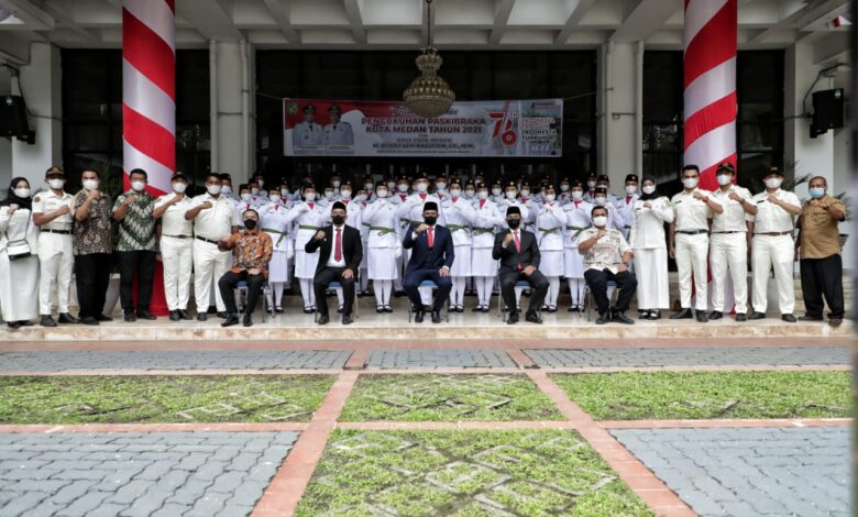 BeritaNasional.ID Medan – Wali Kota Medan Bobby Nasution mengukuhkan Pasukan Pengibar Bendera (Paskibra) Kota Medan tahun 2021 yang akan bertugas mengibarkan bendera Merah Putih pada upacara peringatan hari ulang tahun Ke-76 Kemerdekaan Republik Indonesia pada 17 Agustus 2021 mendatang di Kota Medan. Pengukuhan Paskibra yang diawali dengan Lagu Indonesia Raya ini dilakukan Wali Kota Medan di halaman tengah kantor Wali Kota, Jumat (13/8/2021).