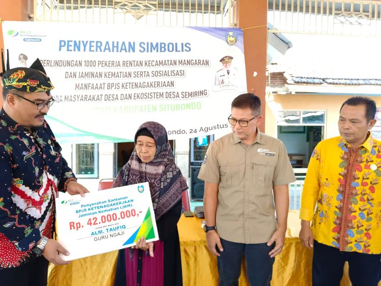 BeritaNasional.ID – SITUBONDO JATIM – Badan Penyelenggara Jaminan Sosial (BPJS) Ketenagakerjaan Situbondo menyerahkan kartu keanggotaan BPJS Ketenagakerjaan kepada pekerja rentan di Desa Semering dan menyerahkan santunan JKM sebesar Rp. 42 juta kepada ahli waris almarhum Tofik yang berprofesi sebagai guru ngaji, Kamis (24/8/2023).