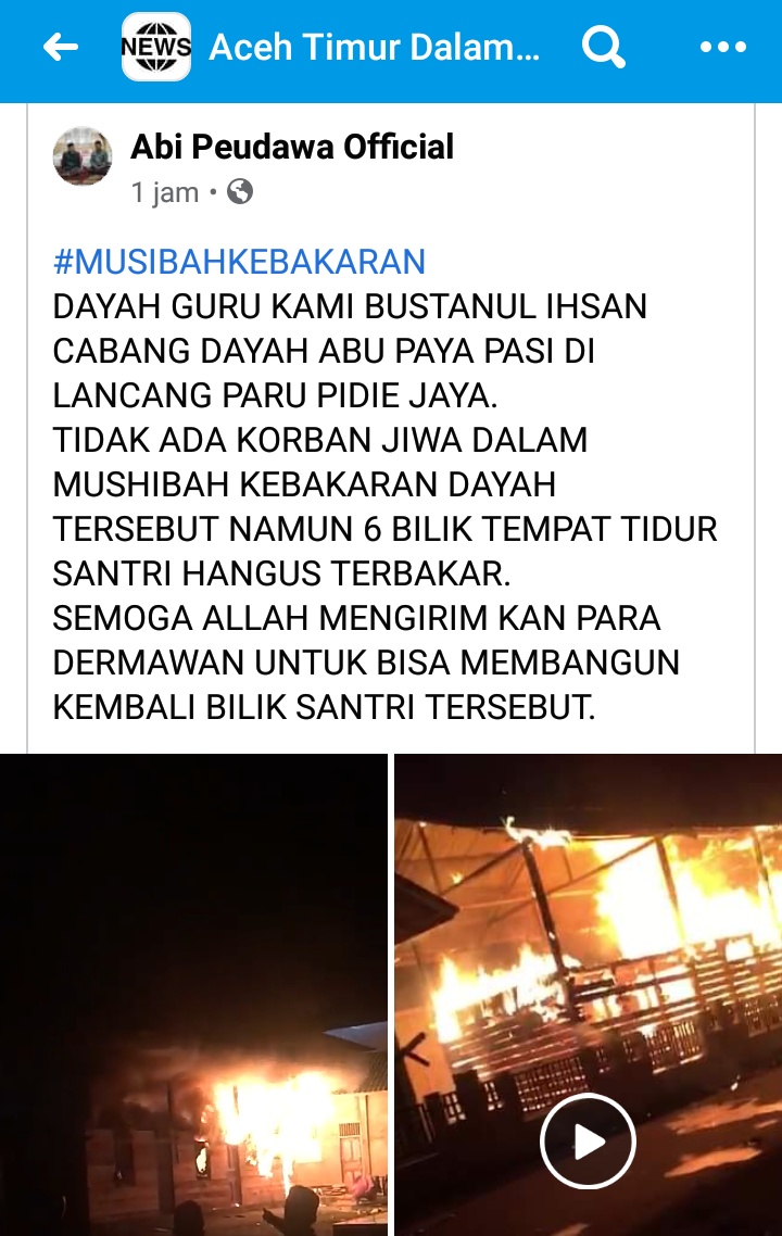 BeritaNasional.ID, PIDIE JAYA — Breaking News, sebanyak enam bilik atau kamar tidur santri di Dayah (pondok pesantren) Bustanul Ihsan Desa Lancang Paru, kecamatan Bandar Baru, kabupaten Pidie Jaya, Provinsi Aceh ludes terbakar, Minggu (25/07/2021).