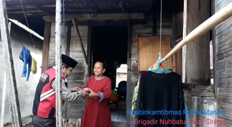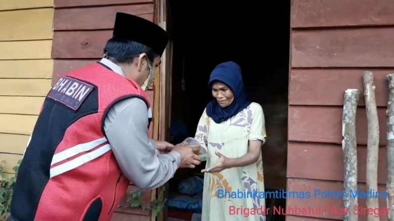 BeritaNasional.ID Medan – Ditengah pandemi Covid-19, personil bhabinkamtibmas Polres Madina Brigadir Nuhbatul Fikar Siregar berbagi takjil untuk puasa dengan warga desa sigalapang Kec. Panyabungan Kab. Mandailing Natal, Sabtu (2/5/2020).