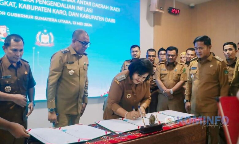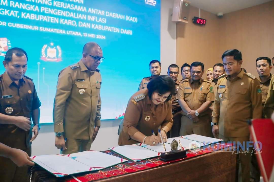 BeritaNasional.ID, KABANJAHE SUMUT – Bupati Karo, Cory Sriwaty Sebayang selaku Ketua TPID Kabupaten dan anggota TPID Provsu hadir menyaksikan penandatanganan Memorandum of Understanding (MoU) Kerjasama Antar Daerah (KAD) Kabupaten Langkat dengan Kabupaten Karo dan Kabupaten Dairi dalam rangka pengendalian inflasi komoditas pangan yang bertempat di Ruang Rapat 1 Lt.2 Kantor Gubernur Sumatera Utara. Senin (13/05/2024).