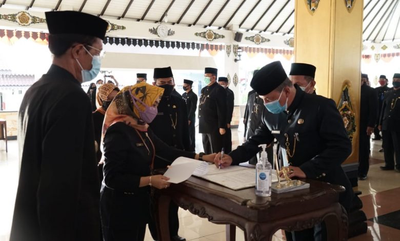 BeritaNasional.ID, Magetan – Bupati Magetan Suprawoto melantik dan mengambil sumpah sejumlah pejabat Pimpinan Tinggi Pratama (Eselon II), pejabat Administrator (Eselon III) dan pengawas dilakukan di lingkungan Pemerintah Kabupaten (Pemkab) Magetan. Jum’at (2/10/2020).