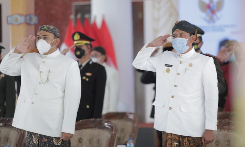 BeritaNasional.ID, Ngawi – Bupati Ngawi, Ony Anwar Harsono bersama Wakil Bupati Dwi Rianto Jatmiko, Ketua DPRD Ngawi, Heru Kusnindar, Sekretaris Daerah Ngawi Mokh. Sodiq Triwidiyanto, beserta Pimpinan Organisasi Perangkat Daerah (OPD) Kabupaten Ngawi mengikuti upacara peringatan Hari Lahir Pancasila yang dipimpin Presiden RI, Joko Widodo yang bertempat di Pendopo Wedya Graha . Selasa (01/06/2021).