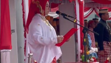 Kerua DPRD Sulbar Dr. Hj. Amalia Fitri Aras, saat membacakan teks Proklamasi di HUT RI ke 80 . (foto fr/Un) Hadiri Upacara HUT ke-80 RI, Ketua DPRD Sulbar Bacakan Naskah Proklamasi