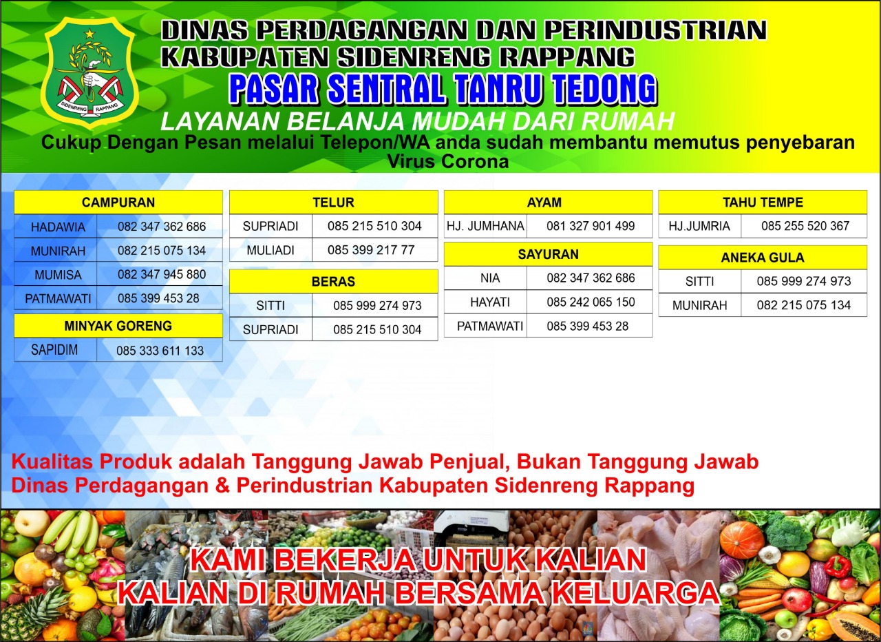 BeritaNasional. ID, Sidrap – Untuk mengantisipasi penyebaran Covid-19 dan pembatasan jam operasional pasar, Pemerintah Kabupaten Sidrap melalui Dinas Perdagangan dan Perindustrian (Disdagperin) mengeluarkan program layanan belanja mudah dari rumah.