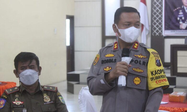 BeritaNasional.ID Sergai – Kapolres Sergai, AKBP Robin Simatupang SH MHum bersama instansi terkait, para pengusaha makanan dan pengusaha cafe menggelar rapat kordinasi penanganan pandemi covid-19 serta penegakan hukum di Kabupaten Sergai, bertempat di Aula Patriatama Polres Serdang Bedagai (Sergai), Selasa (13/7/2021).