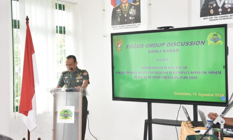 BeritaNasional.ID, GORONTALO – Dalam mencegah dan mengatasi terjadinya konflik sosial di wilayah pertambangan/industri Gorontalo, Staf Ahli Kepala Staf Angkatan Darat (Sahli Kasad) menggelar Forum Grup Discussion (FGD) bertempat di Makorem 133/NW, Jalan Trans Sulawesi, Desa Tridharma, Kecamatan Pulubala, Kabupaten Gorontalo, Selasa (13/8/2024).