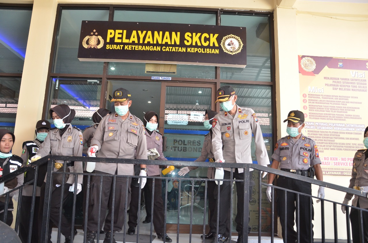 BeritaNasional.ID, SITUBONDO – Mengantisipasi penyebaran virus corona (covid-19) di Indonesia khususnya di Situbondo, Polres Situbondo menggelar kegiatan bersih-bersih diruangan dan sekitar kantor Mapolres, Sabtu (14/3/2020).