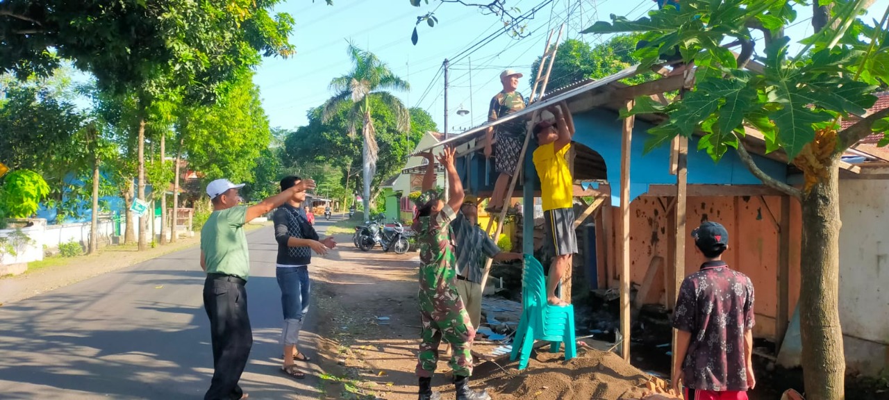 Koramil 0820/21 Maron bersama masyarakat Desa Maron Kulon melaksanakan kerja bakti membersihkan bangunan semi permanen yang tidak lagi berfungsi yang berada di samping kanan kiri jalan desa setempat.