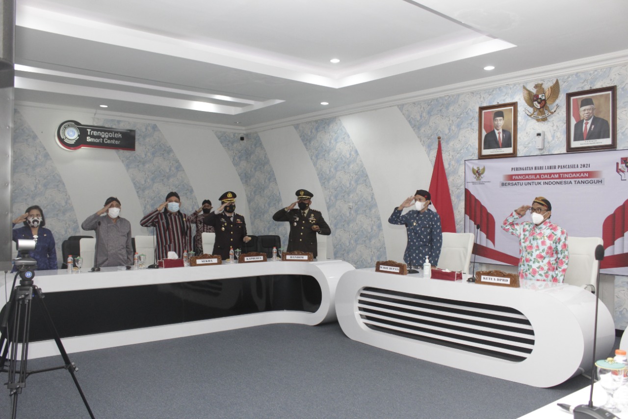 BeritaNasional.ID, TRENGGALEK – Komandan Kodim 0806/Trenggalek bersama Forkopimda Trenggalek Propinsi Jawa Timur mengikuti Upacara Peringatan Hari Kelahiran (Harlah) Pancasila Tahun 2021 di Gedung Smart Center Kabupaten Trenghgalek secara virtual bersama Presiden RI, Selasa (1/6/2021).