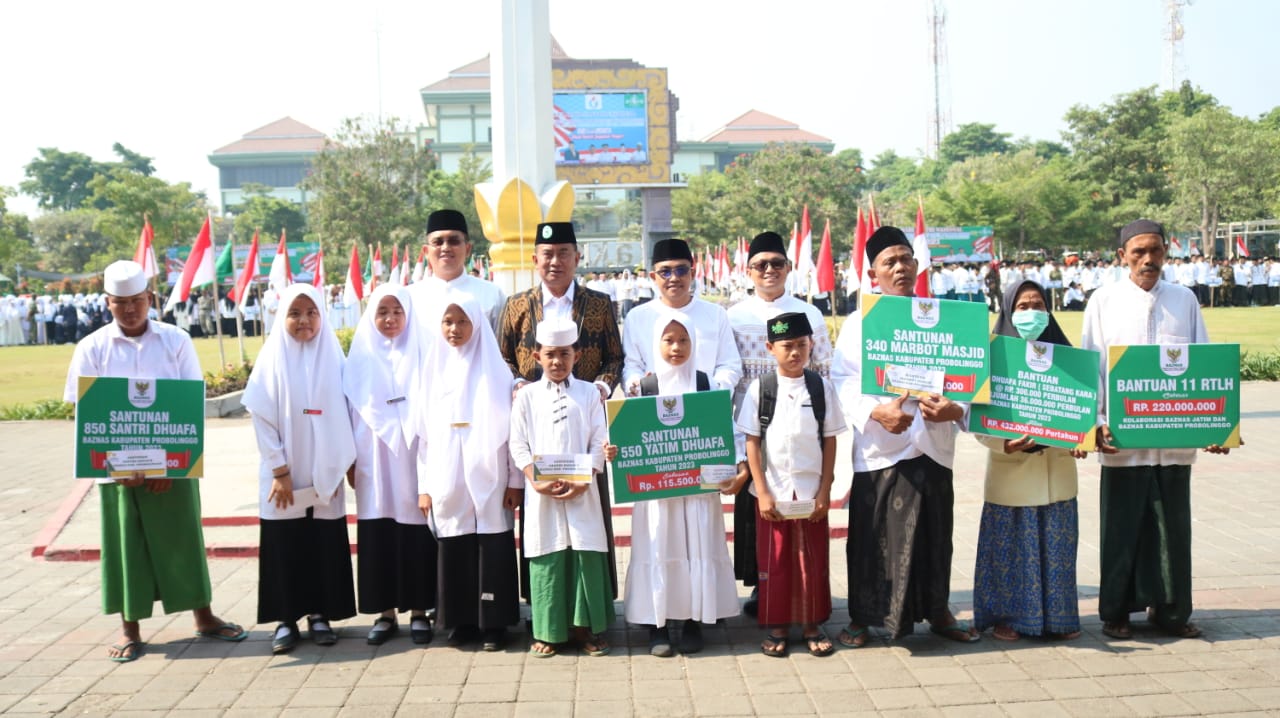 Untuk diketahui dalam apel hari santri nasional kali diserahkan bantuan sosial oleh Baznas Kabupaten Probolinggo kepada santri dhuafa, yatim dhuafa, marbot masjid, fakir dhuafa dan penyerahan rumah tidak layak huni kepada 11 penerima manfaat.