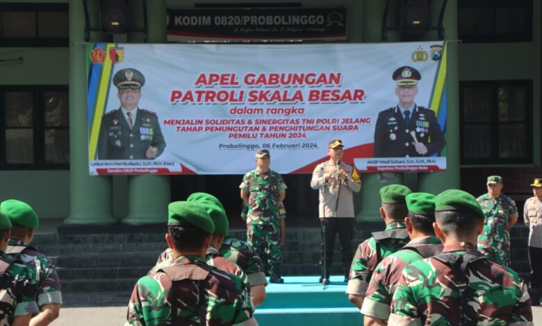 BeritaNasional.ID, PROBOLINGGO JATIM-Komandan Kodim (Dandim) 0820/Probolinggo Letkol Arm Heri Budiasto memimpin langsung gelaran apel gabungan dan patroli skala besar menjelang pengamanan tahap pemungutan dan penghitungan suara pada Pemilu 2024 mendatang di halaman Makodim setempat.