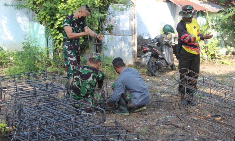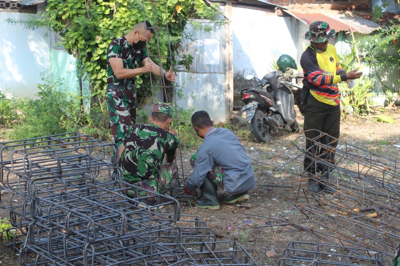 Bahkan Dandim ikut menganyam besi yang akan digunakan mengecor pondasi bangunan.