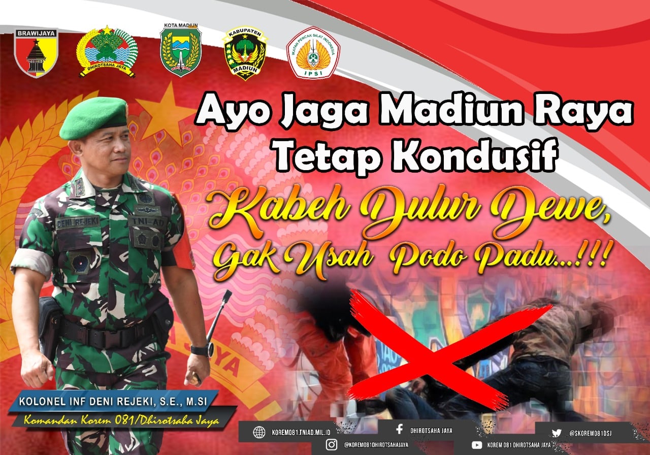 Madiun, BeritaNasional.ID – Beredar luas di media sosial unggahan Danrem 081/DSJ, Kolonel Inf Deni Rejeki tentang ajakan untuk saling menjaga kondusifitas wilayah di Madiun Raya.