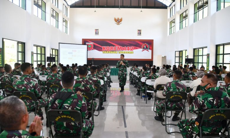 Danrem 142/Tatag Brigjen TNI Firman Dahlan, S.I.P dalam arahannya didepan personel Korem, memberi motivasi dan semangat untuk melaksanakan tugas dengan etos kerja yang baik dalam rangka mendukung tugas pokok satuan.