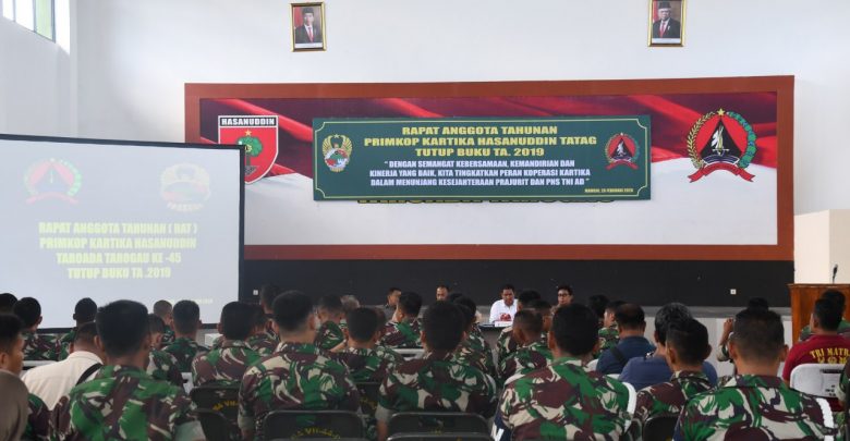 Mamuju.Sulbar.Beritanasional.id– Rapat anggota tahunan Primkop Kartika Hasanuddin Tatag ke 45 tutup buku TA 2019 yang dibuka oleh Danrem 142/Tatag Kolonel Inf. Eventius Teddy Danarto dalam hal ini diwakili oleh Pasi Ren Mayor Inf. Akhmar bertempat diaula Andi Depu Korem 142/Tatag Jl. Abd. Malik Pattana Endeng Mamuju Prov. Sulbar yang diikuti seluruh Prajurit dan PNS Korem 142/Tatag (26/02)