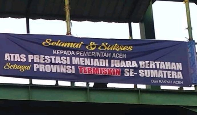 Spanduk berukuran 300×60 Sentimetar yang di unggah oleh Akun Facebook atas nama Dicky Juliadi ini bertulisan “Selamat Datang di Provinsi Termiskin di Sumatra” dengan mewarnai Tulisan Termiskin dengan warna merah. Sedangkan untuk sepandung ucapan selamat disematkan di dinding jembatan penyebarang Jambo Tape, sebagaimana yang di Unggah oleh Akun Facebook Teuku Affiguddin, dengan tulisan ” Selamat dan Sukses kepada Pemerintah Aceh atas Perstasi menjadi juara bertahan sebagai Provinsi Termiskin Se-Sumatra”.