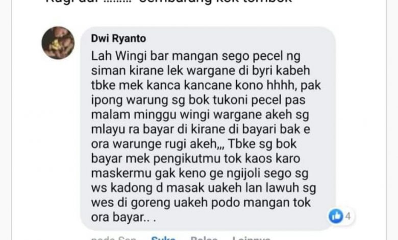 Dalam tulisannya tersebut, Dwi Ryanto mengatakan, ” Lah Wingi bar mangan sego pecel ng siman kirane lek wargane di byri kabeh tbke mek kancane kono hhhh, pak ipong warung sg bok tukoni pecel pas malam minggu wingi wargane akeh sg mlayu ra bayar di kirane di bayari bak e ora warunge rugi akeh,,, Tbke sg bok bayar mek pengikutmu tok kaos karo maskermu gak keno ge ngijoli sego sg wis kadong d masak uakeh lan lawuh sg wes di goreng uakeh podo mangan tok ora bayar.. . “.